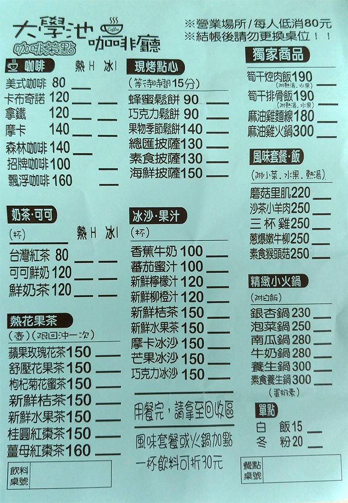 (大學池咖啡廳菜單Menu 可點圖放大看更清楚)